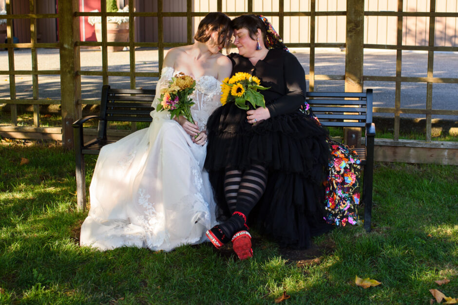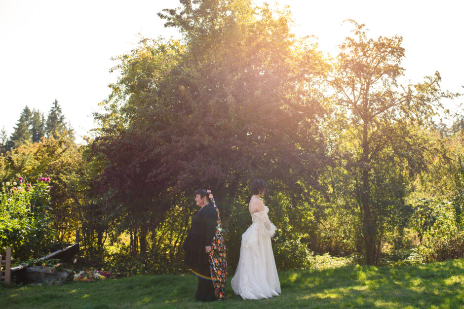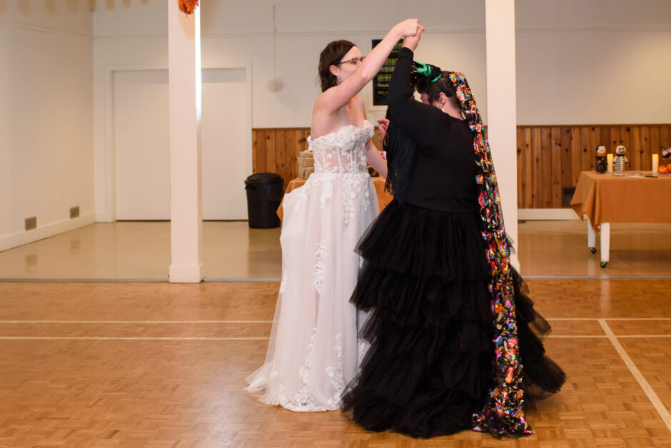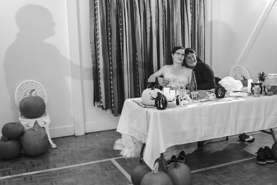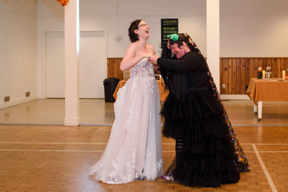 As promised on their Halloween-themed engagement post, I’m so excited to share Cathy and Pthia’s fun fall costumed wedding at Prospect Lake Community Hall. We started out with a first look with some surprising October sun and heat. I though Cathy might struggle in her long sleeved outfit (from Unique Vintage and Kate Hewko), but she survived and looked awesome doing it (seriously, I think I would take wedding dress inspiration from her colourful veil, tiered tulle skirt, and stripy black stockings.) I loved how Pthia’s beautiful white dress (from Blush) was such a contrast to Cathy’s outfit, but they were both dramatic and sparkly.