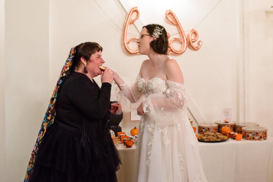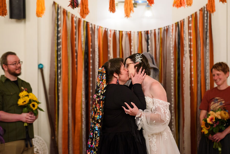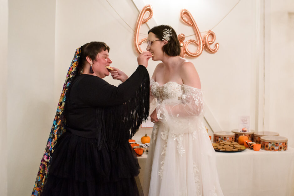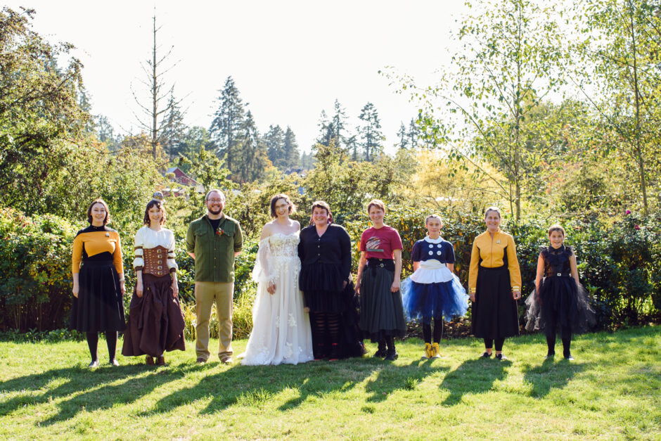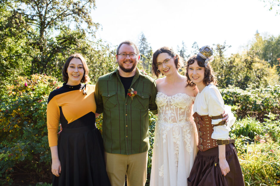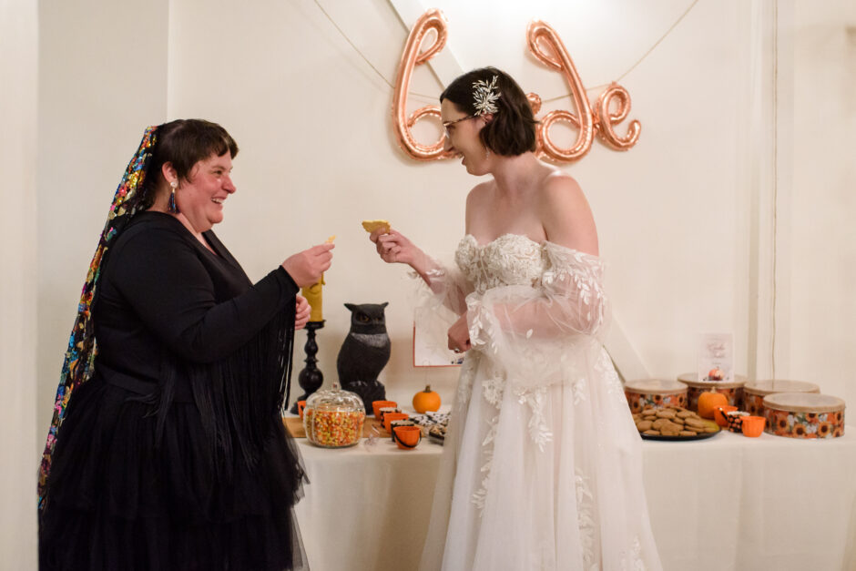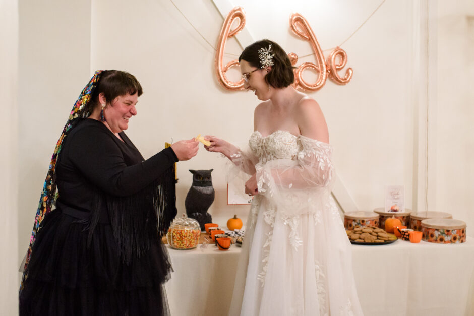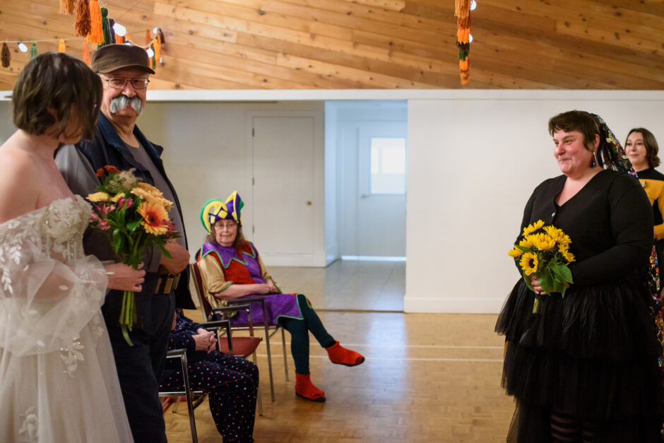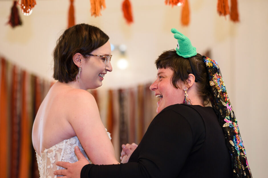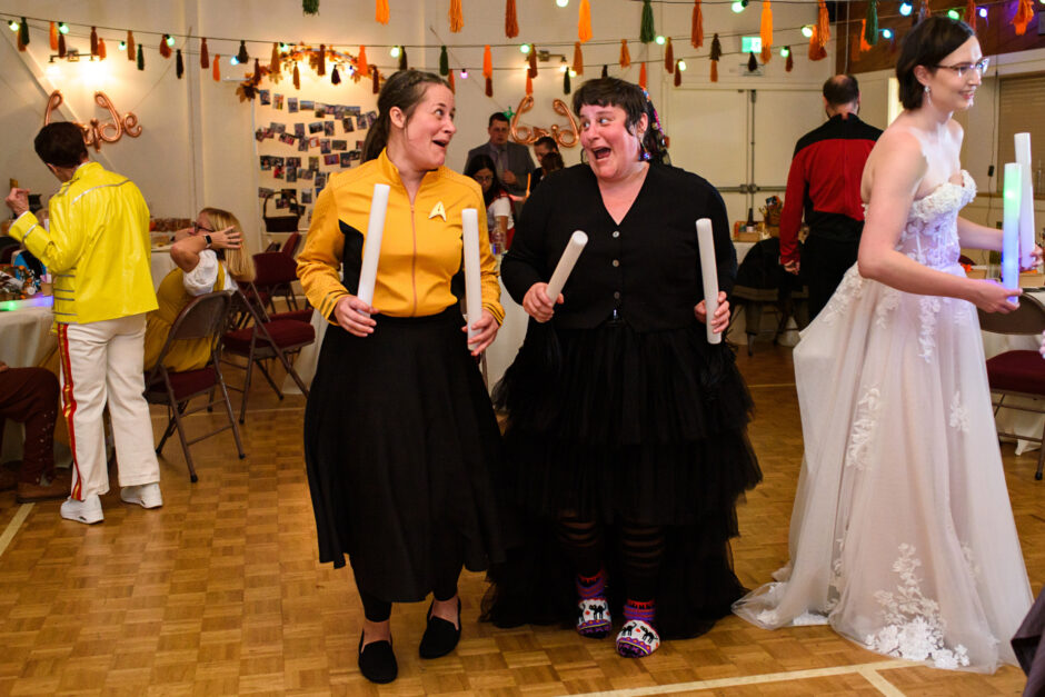 They were so excited to see each other and the wedding party happily watched their first look from the sidelines. The wedding party had some amazing outfits of their own with elevated interpretations of characters from Star Trek, The Last of Us, and Bioshock – plus flower girl Wednesday Addams. We took some wedding party photos, some quick couple portraits, and then headed inside where the brides mingled with their guests before the ceremony.