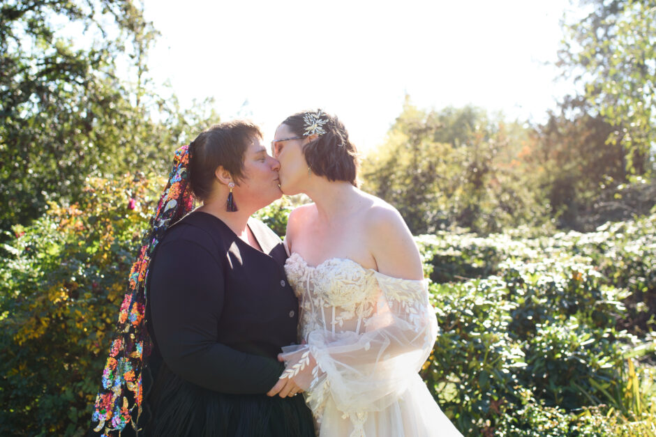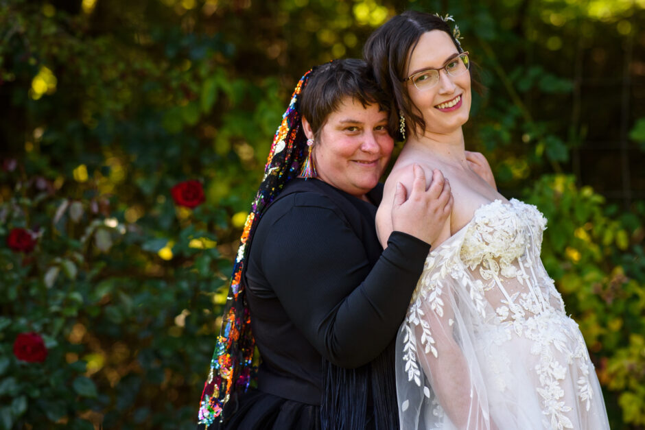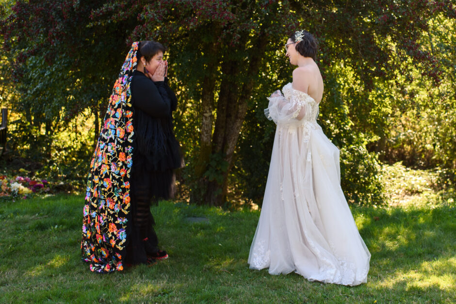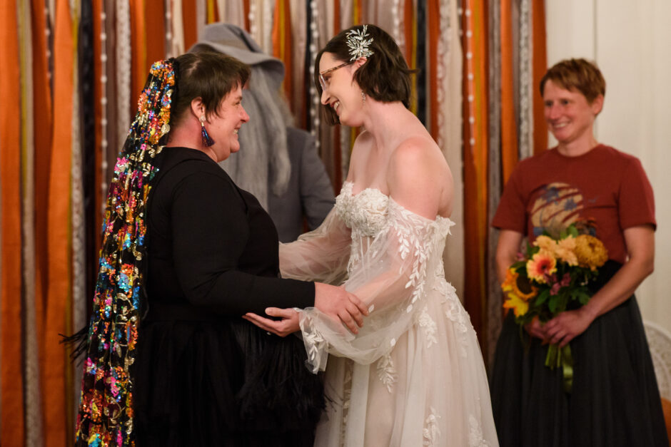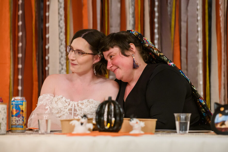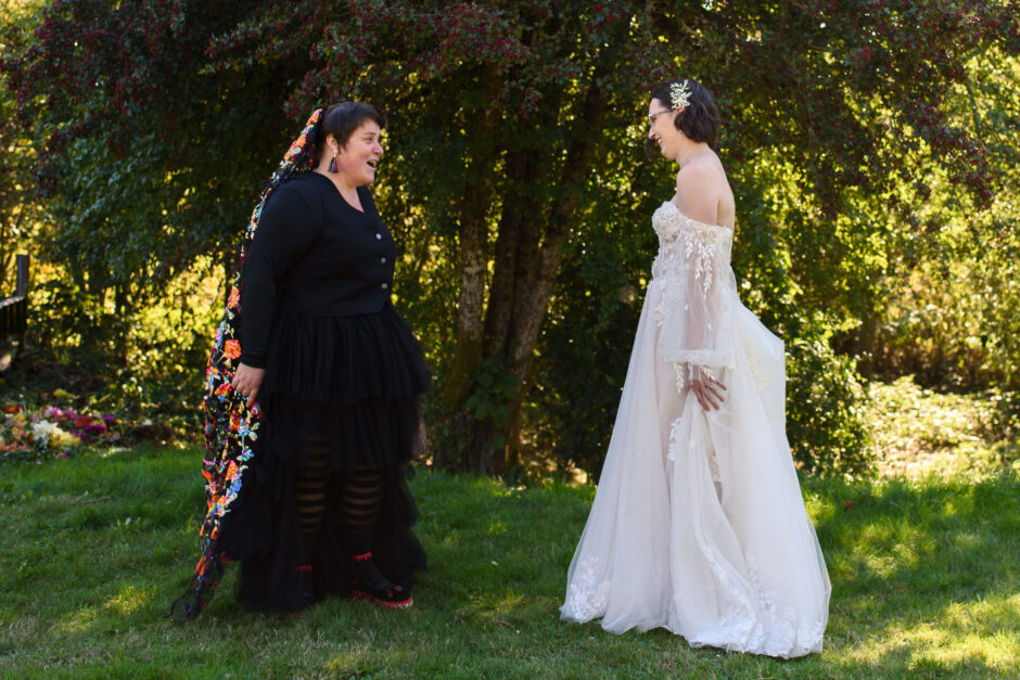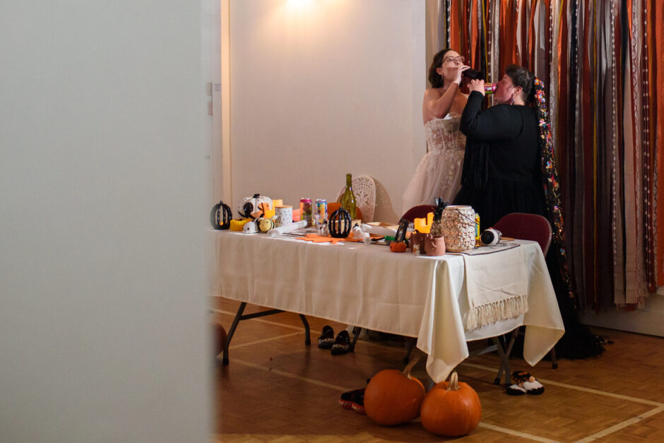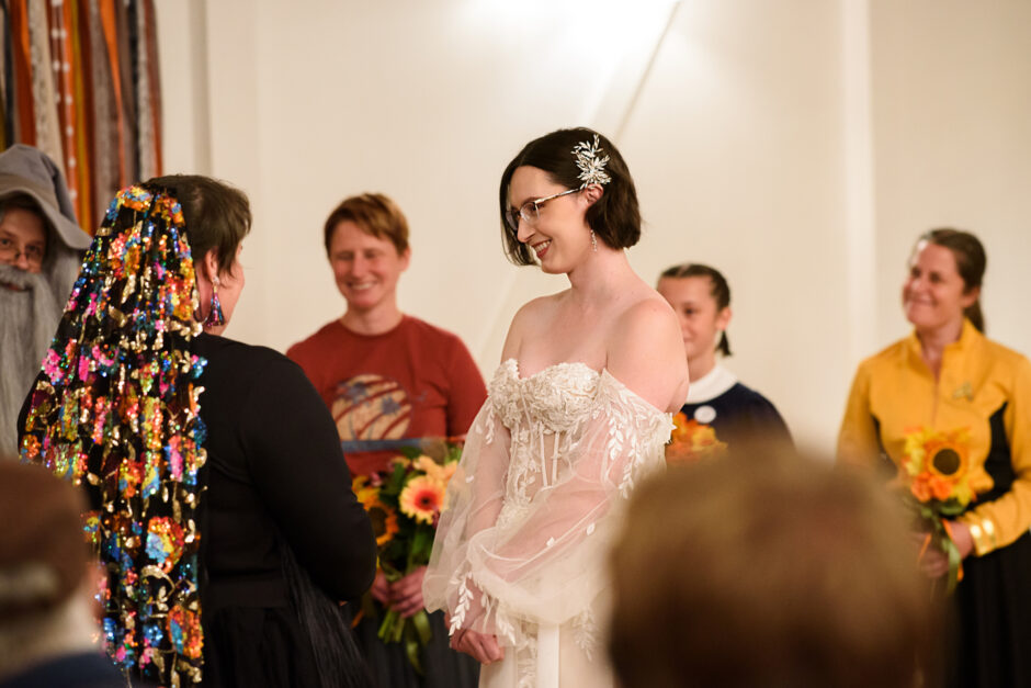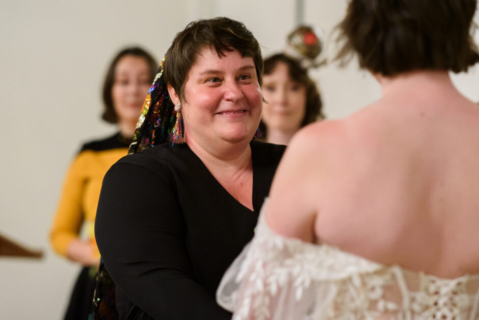 They were so excited to see each other and the wedding party happily watched their first look from the sidelines. The wedding party had some amazing outfits of their own with elevated interpretations of characters from Star Trek, The Last of Us, and Bioshock – plus flower girl Wednesday Addams. We took some wedding party photos, some quick couple portraits, and then headed inside where the brides mingled with their guests before the ceremony.