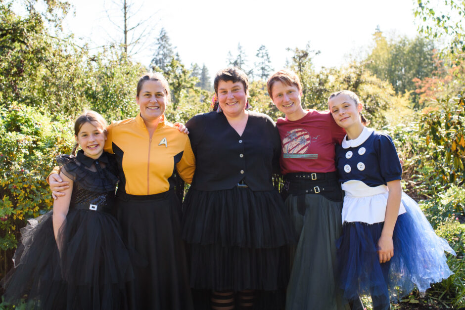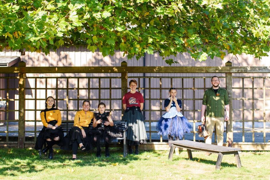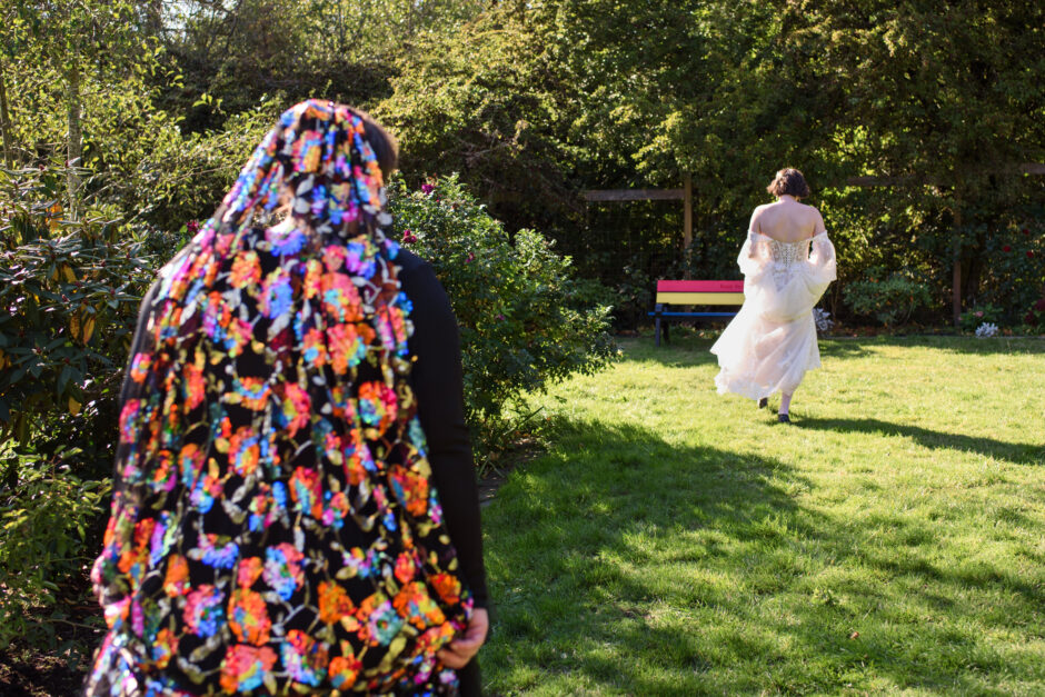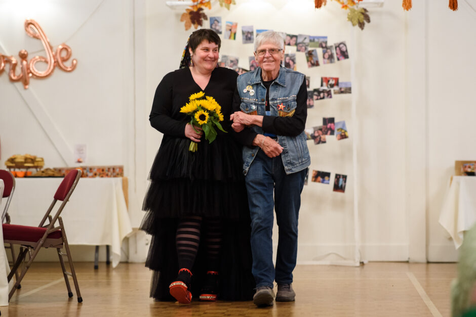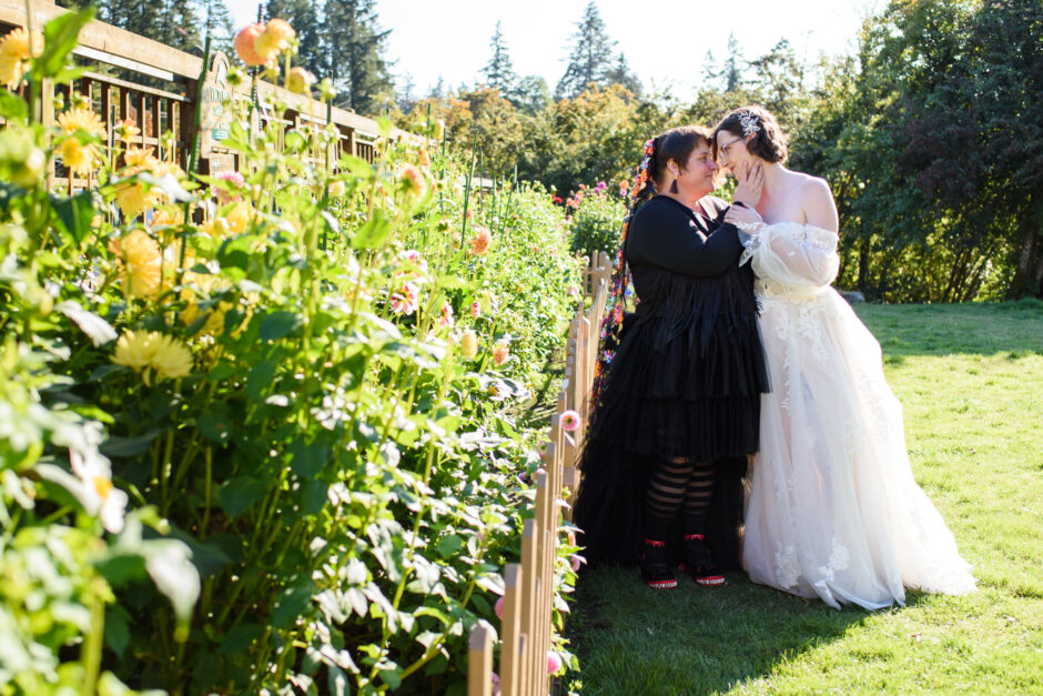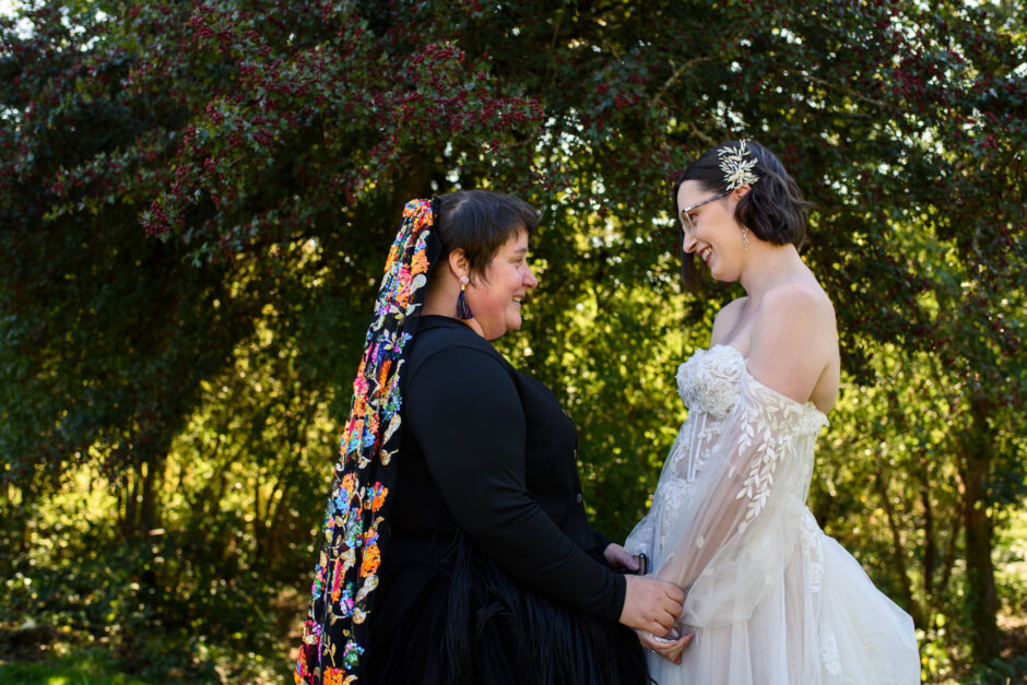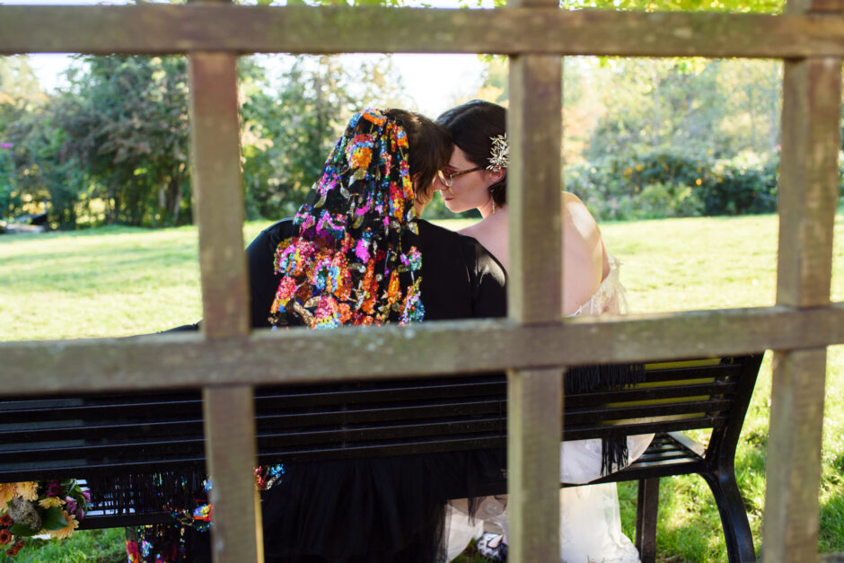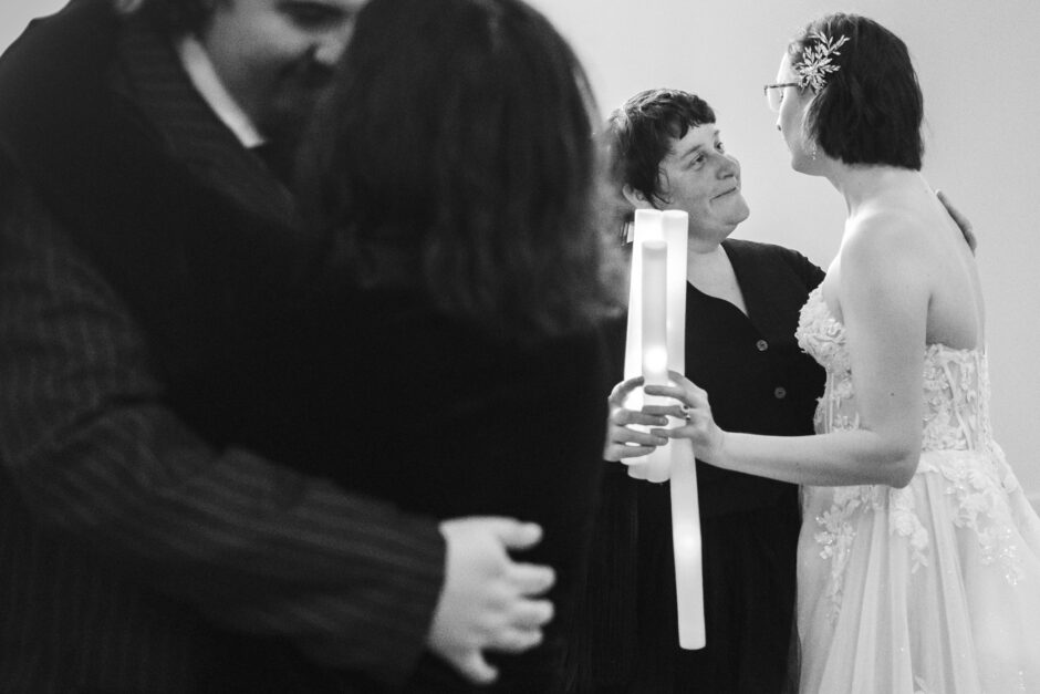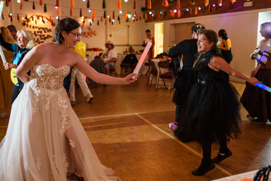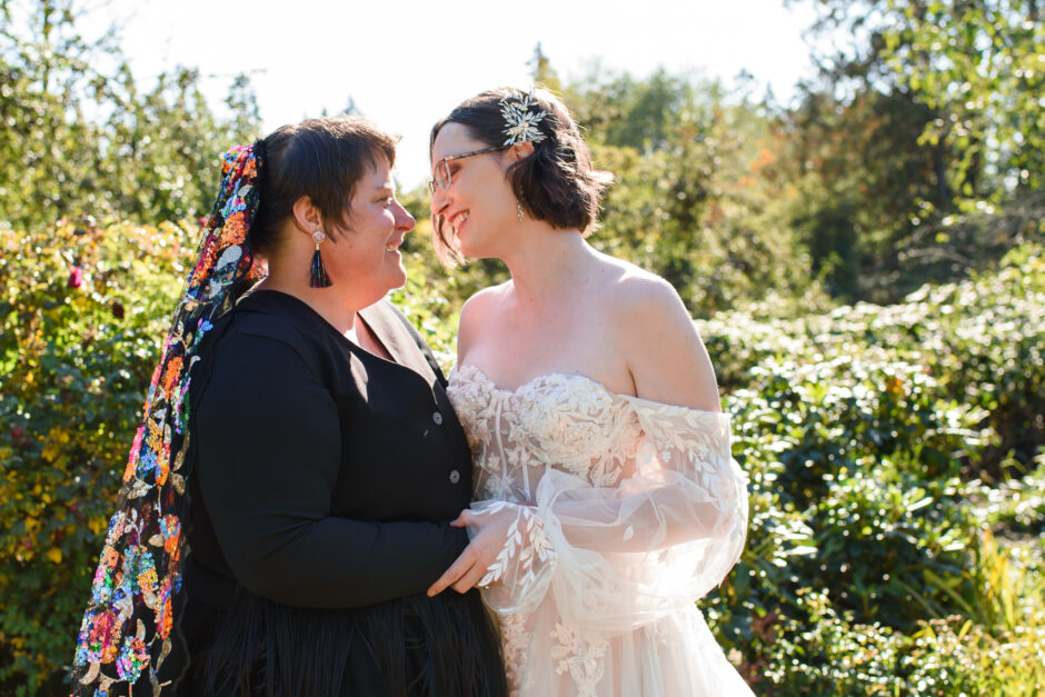 They were so excited to see each other and the wedding party happily watched their first look from the sidelines. The wedding party had some amazing outfits of their own with elevated interpretations of characters from Star Trek, The Last of Us, and Bioshock – plus flower girl Wednesday Addams. We took some wedding party photos, some quick couple portraits, and then headed inside where the brides mingled with their guests before the ceremony.