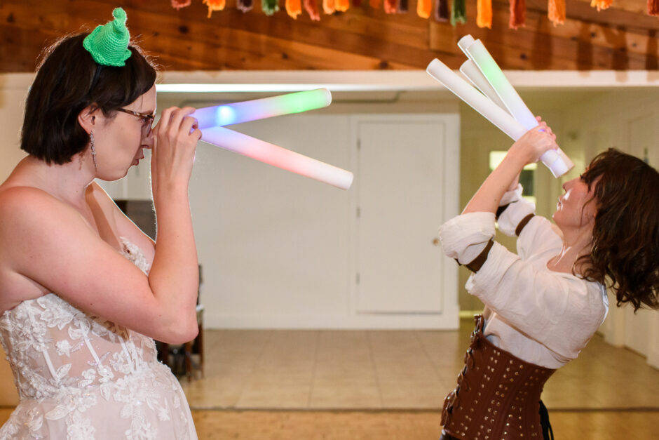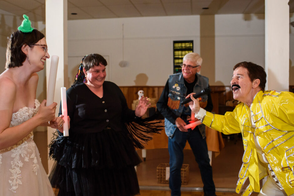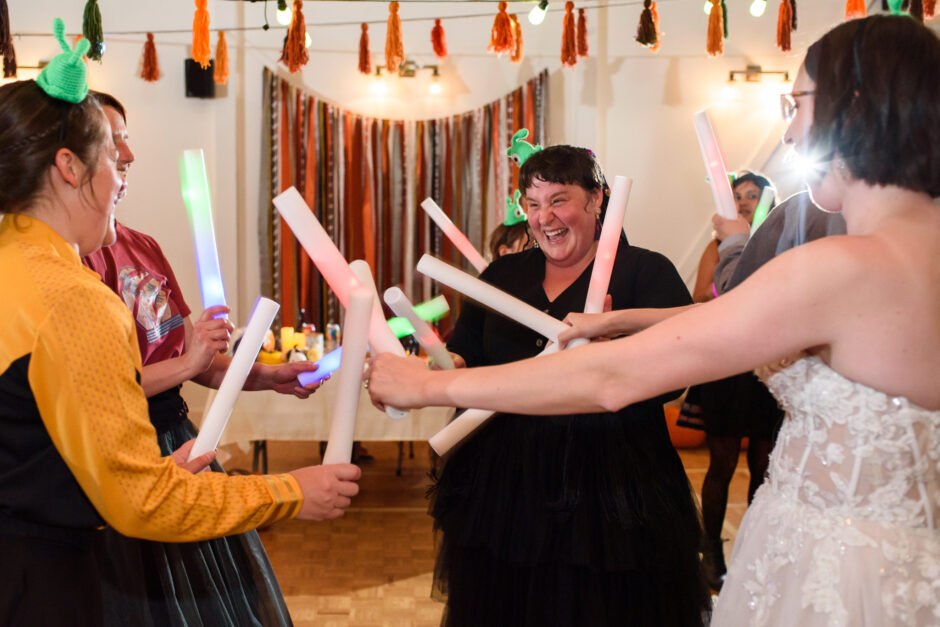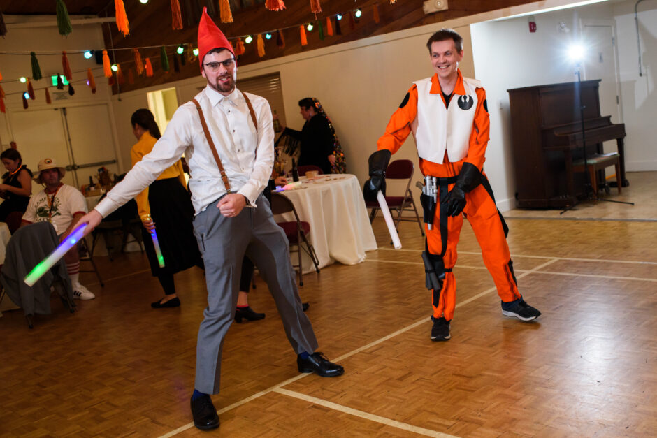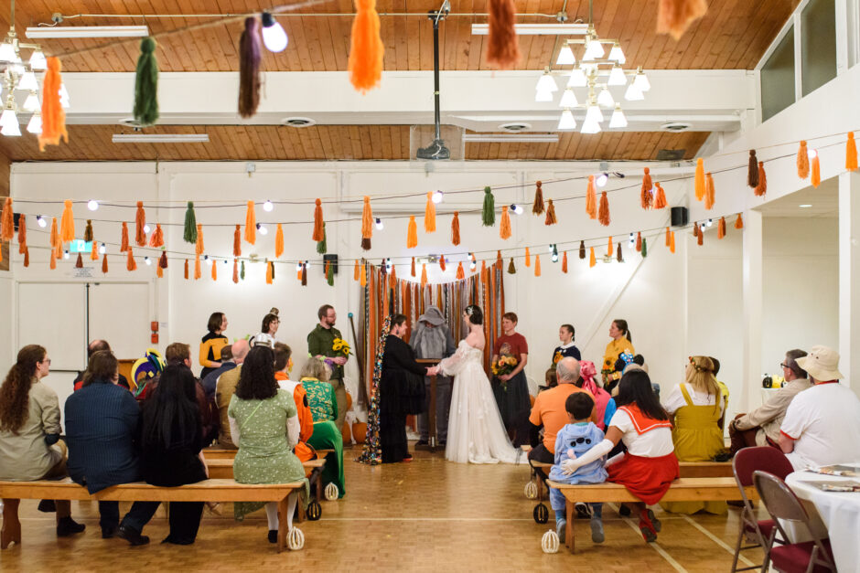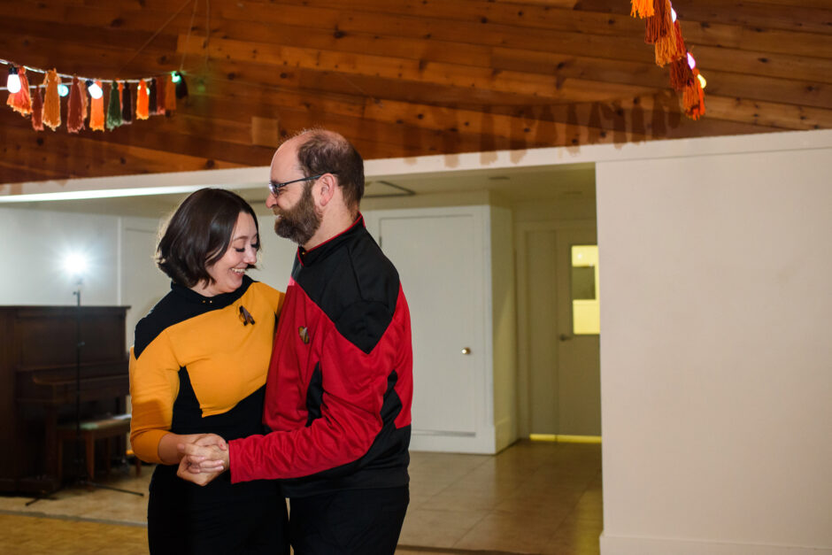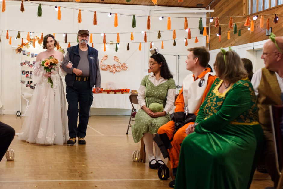 The couple suggested their guests wear costumes, but they weren’t sure if everyone would. Every guest came through pretty spectacularly though! Cathy’s brother officiated the ceremony dressed as Gandalf (if Gandalf ever wore a suit). Their MC (and date) dressed as a character from Over the Garden Wall.