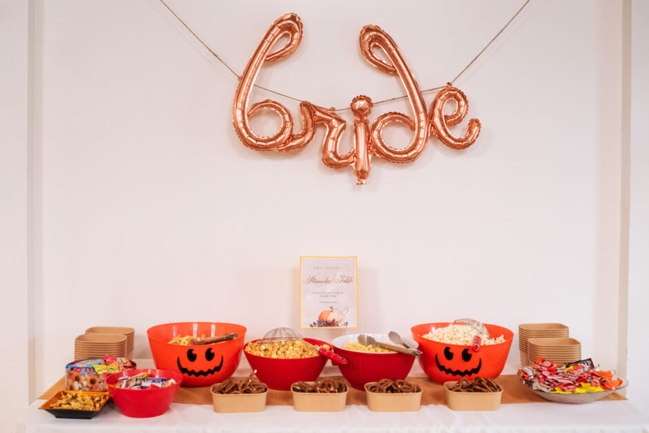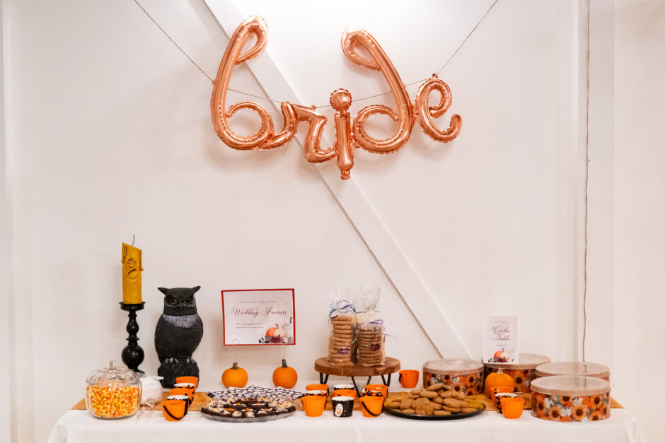 The wedding details were very DIY (see below), including their dinner, which consisted of a make-your-own-sandwich bar, plus tables of snacks and homemade desserts. The heartfelt parts of the toasts only seemed a little funny due to the costumes.