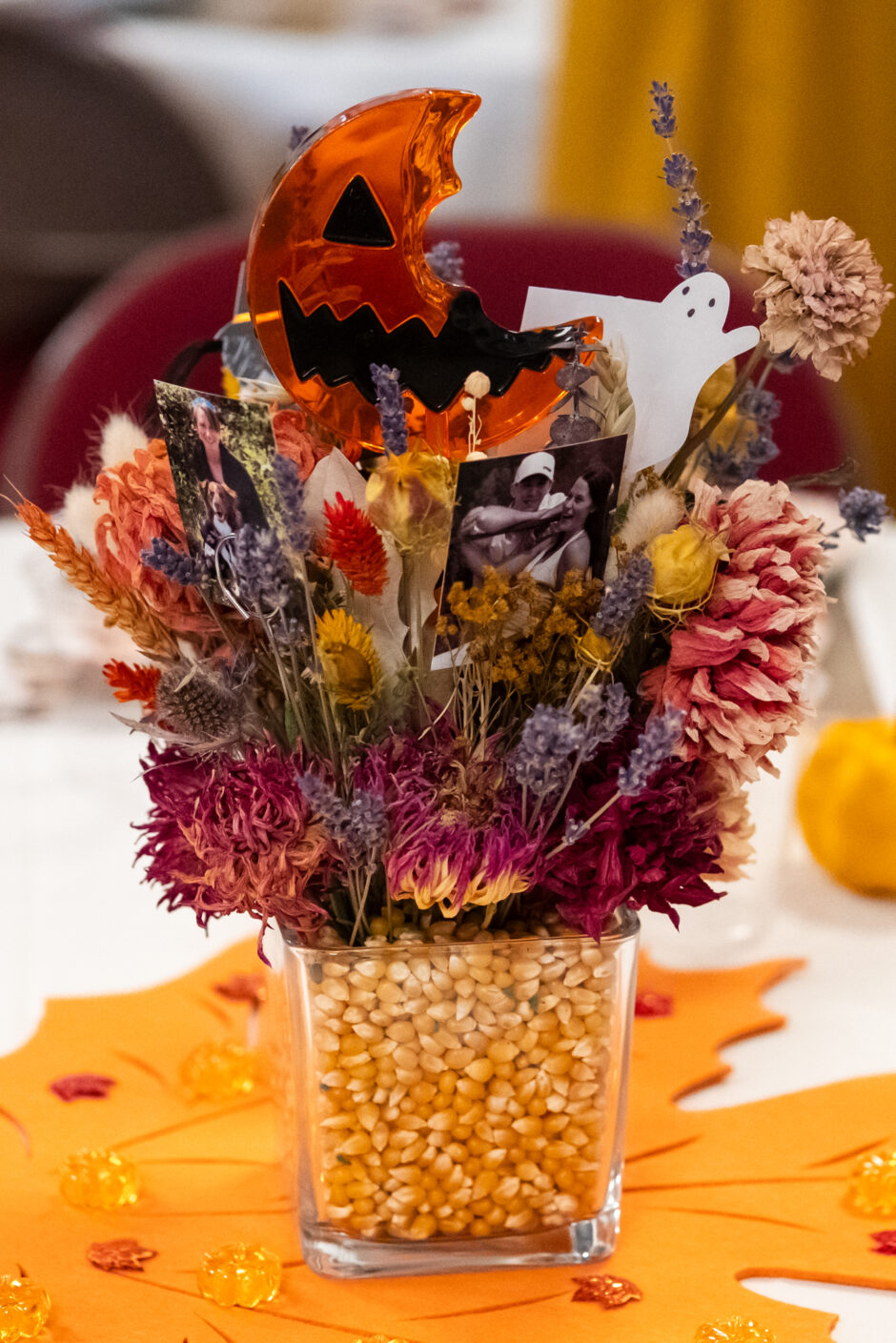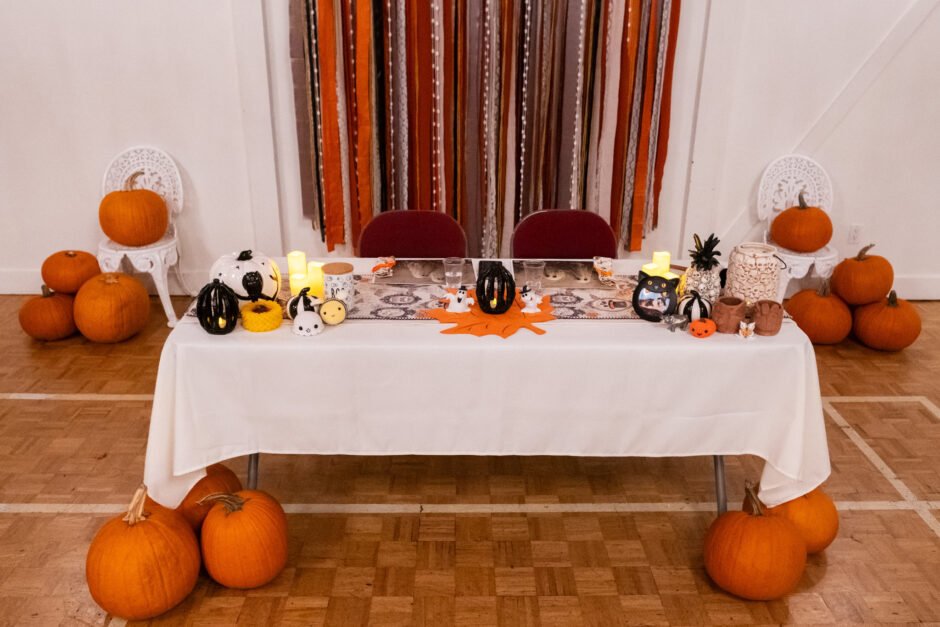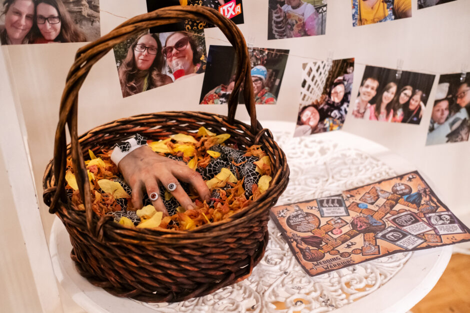I don’t usually post a lot of detail photos, but I just had to include all the fun, DIY details the couple and their guests created. Credit for most of these photos go to my second shooter, Webmeister Bud, who has an eye for details and was also geeking out over all of the pop culture references. Some favourites of mine: the brain slug hats made by a mother-of-the-bride, the tables had a photo of each guest incorporated into the floral centerpiece (including some wedding photos), their eyeball wedding rings, the guestbook consisting of art prints for the guests to write a message on the back of, and photos from their engagement in various places around the room, including their kitty on the sweetheart table.